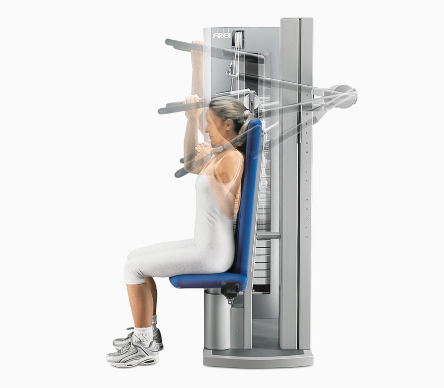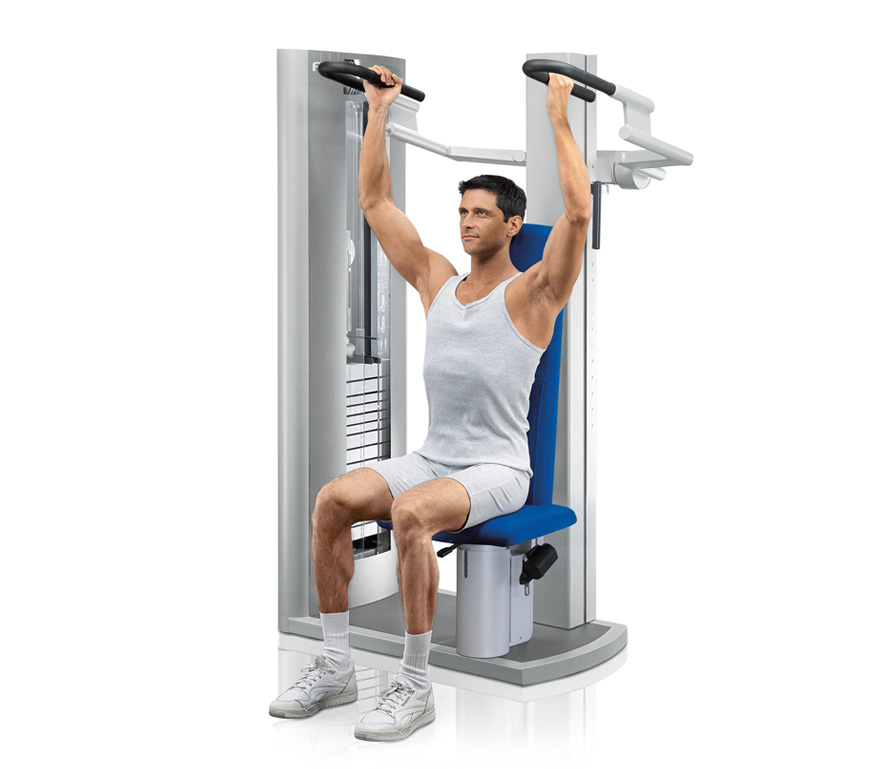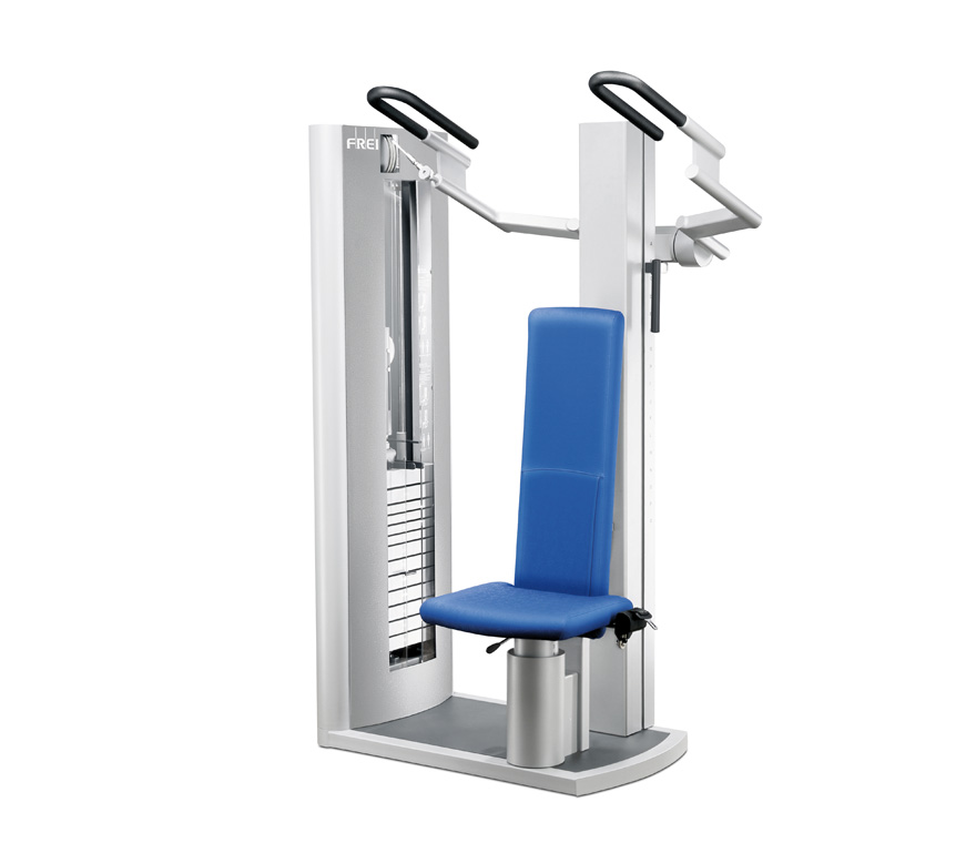 Nur ein einziger Hebel muss gedrückt werden und der Trainingsarm kann ohne Kraftaufwand auf der leichtgängigen Linearschiene bewegt werden. So wird das Pull Down zum Dip Gerät.