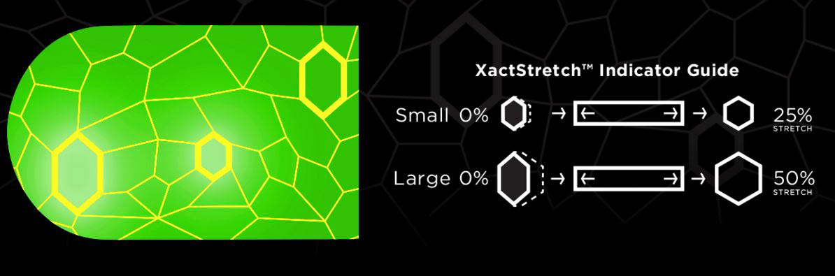 Vorteil der Wabenstruktur: Dr. Phil Page, Leiter der TheraBand Academy, hat zum Thema Kinesiologisches Taping alle vorhandenen internationalen Studien ausgewertet. Vor allem waren die Studien erfolgreich, die mit einer Zugspannung von weniger als 50 % gearbeitet haben. Die am häufigsten genutzte Zugspannung war sogar kleiner/gleich 25 %. Auf der Grundlage dieses Ergebnisses wurde das Tape mit dem Rautenmuster entwickelt, welches dadurch eine direkte visuelle Kontrollfunktion bietet in dem, aus wissenschaftlicher Sicht, „erfolgreichsten" Zugbereich zu kleben.