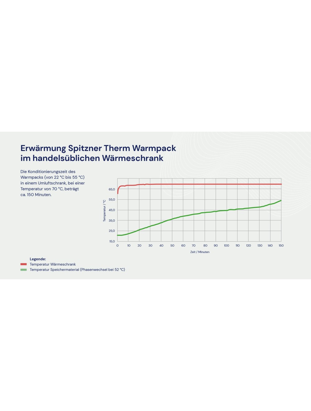 Einfache Anwendung: Der Spitzner Therm Warmpack wird auf einem gewöhnlichen Fangoblech (50 x 70 cm oder 40 x 60 cm) in einem handelsüblichen Wärmeschrank (keine Mikrowelle oder Wasserbad) auf 70 °C erwärmt und bei dieser Temperatur im Schrank gehalten (maximal sind 75 °C möglich). Einige Minuten vor der Anwendung wird der Warmpack entnommen. Die Packung hat zunächst eine Oberflächentemperatur von 70 °C, die innerhalb von wenigen Minuten auf 52 °C absinkt. Diese Wärme gilt als therapeutisch besonders wirksam und wird während der gesamten Anwendungsdauer gehalten (die Wärmebehandlung sollte 25 bis 30 Minuten nicht überschreiten). Die auf 52 °C abgekühlte Packung wird auf dem Behandlungstisch ausgebreitet. Anschließend wird der Warmpack dem Patienten anmodelliert. Aus hygienischen Gründen bzw. zur Linderung der ersten Kontaktwärme empfehlen wir die Abdeckung des Warmpacks mit einem Tuch aus Baumwolle/Leinen/Frottee oder einem Einmalvlies (Spitzner Spinnfaservlies). Wenn der Patient transpiriert, nimmt das Abdeckmaterial die Feuchtigkeit weitestgehend auf. Die Oberfläche des Spitzner Therm Warmpacks ist flüssigkeitsabweisend. Nach der Anwendung wird der Spitzner Therm Warmpack desinfiziert. Wärmetherapie bei subakuten und chronischen Zuständen des rheumatischen Formenkreises (entzündliche und degenerative Gelenk- und Wirbelsäulenerkrankungen, „Weichteilrheumatismus”) bei postakuten Zuständen nach Traumen am Bewegungsapparat zur Schmerzlinderung Gegenanzeigen: Akute Entzündungszustände, akute Zustände nach Traumen, Blutungen, Ödeme, makro- und mikroangiopathische Durchblutungsstörungen der Haut, Fieberzustände, Hautareale mit Sensibilitätsstörungen, großflächige Hautverletzungen und akute Hautkrankheiten