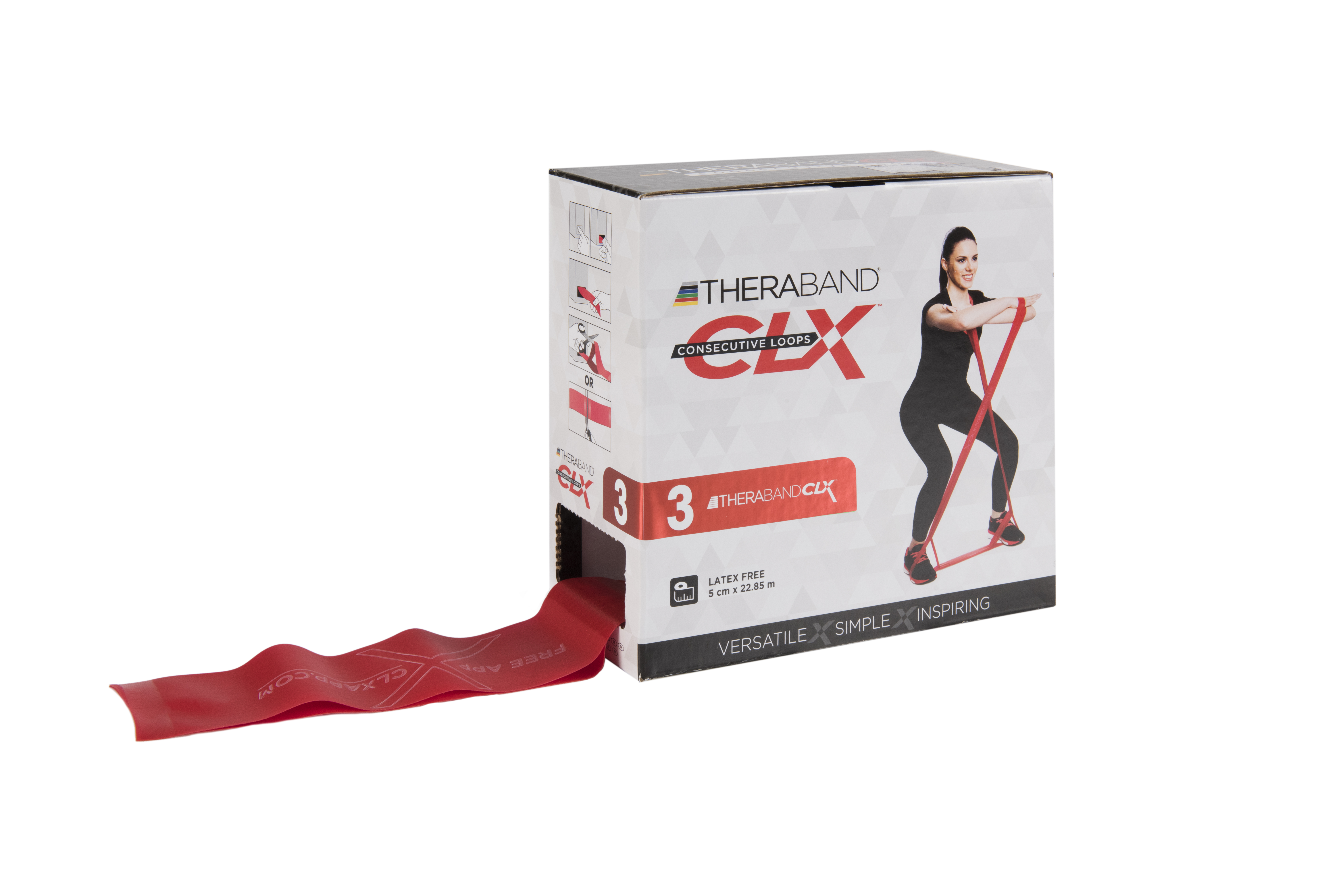 Neue individuelle Griffoptionen und neuartige Trainingsmöglichkeiten für ein einfaches, vielseitiges und progressives Widerstandstraining. Das CLX eignet sich für alle Trainingssituationen von Physiotherapie bis Athletiktraining und entspricht mit seinem farbcodierten System dem bekannten Thera-Band-Übungsband. Das Latexfreie Band mit Griffschlaufen (patentiertes Easy Grip Loop-System), die ein einfaches Greifen und Befestigen der Bänder ermöglichen - ohne Wickeln oder Knoten.Erhältlich in 7 Widerstandsstufen; latexfrei - Synthese-Kautschuk Breite ca. 5 cm; Länge ca. 22 m = 10 CLX Einzelbänder mit Schlaufen