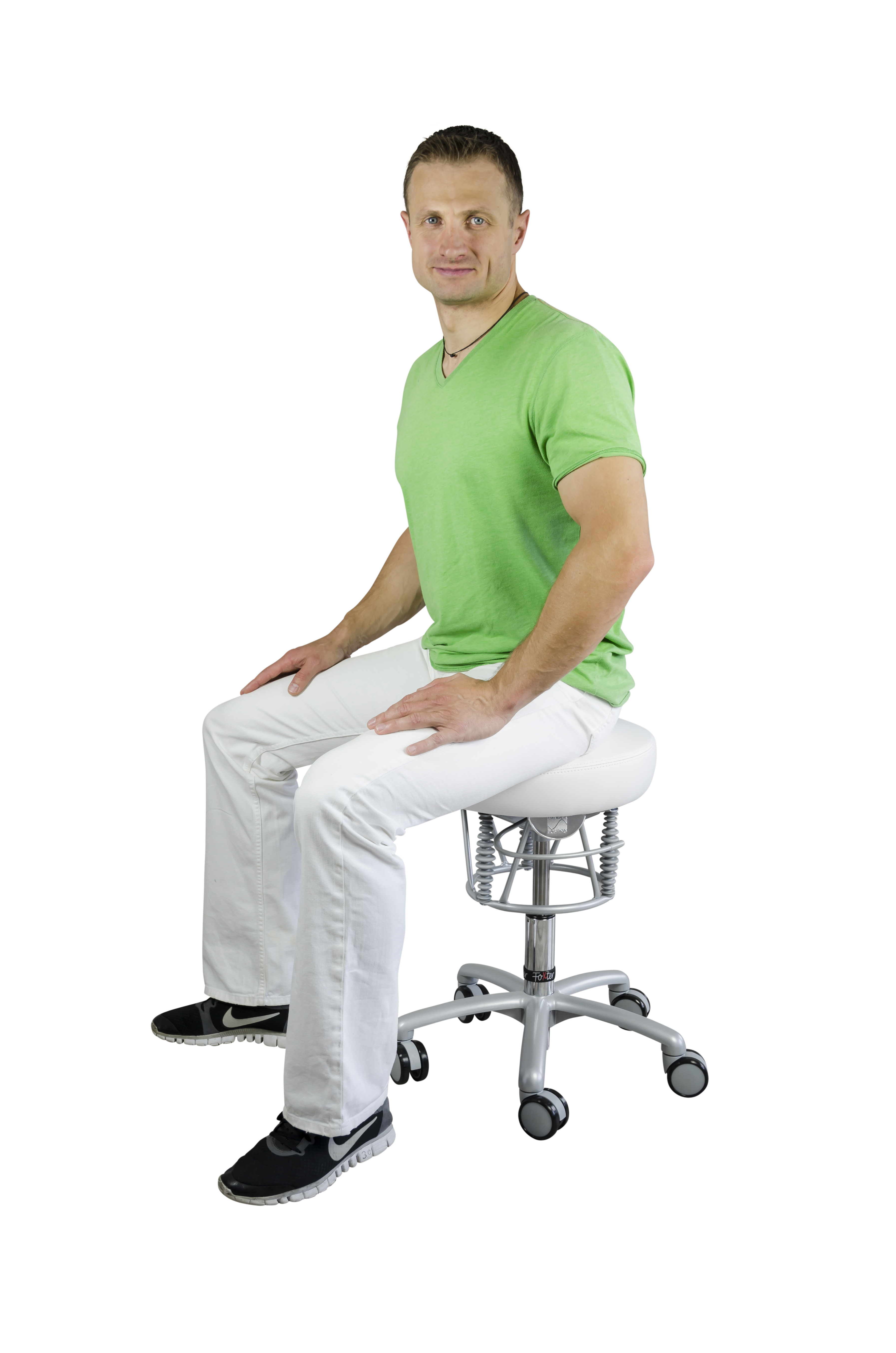 Das stabile Aluminium-Fußkreuz sorgt für sicheren Stand, während die weichen Rollen ein komfortables und bodenschonendes Bewegen ermöglichen. Die Ausführung in silber mit weißem Bezug fügt sich harmonisch in moderne Praxisräume ein.